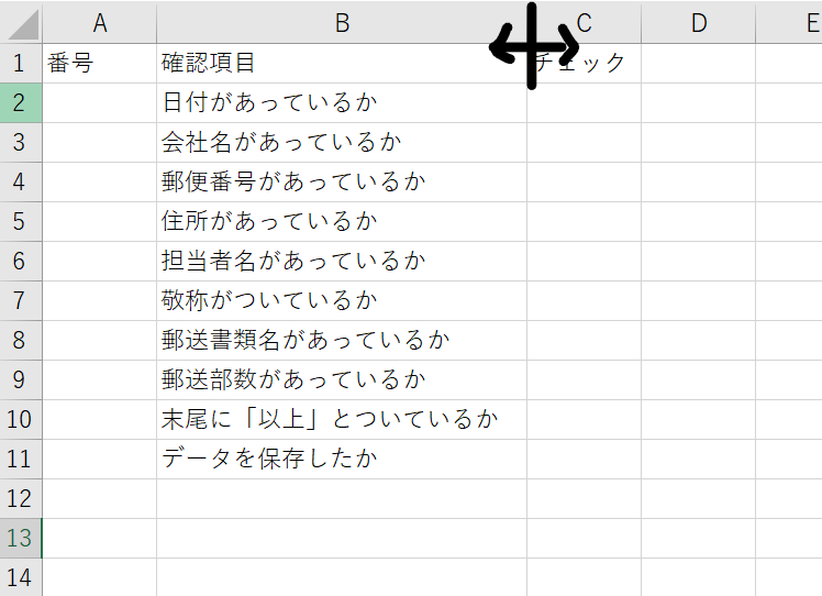 ②「A-1」セルに「番号」・「B-1」セルに「確認項目」・「C-1」セルに「チェック」と記入